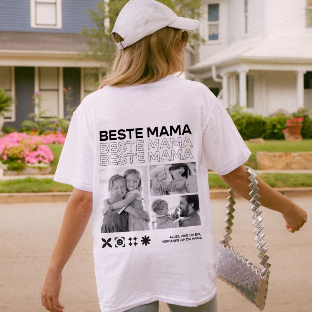Manche Geschenke kauft man einfach. Und manche denkt man sich. Dieses T-Shirt gehört zur zweiten Kategorie. Mit deinen persönlichen Schwarz-Weiß-Fotos und einem Text, der wirklich von Herzen kommt, entsteht ein Unikat, das Mama immer wieder in die Hand nehmen wird – auch wenn sie es gerade nicht trägt.